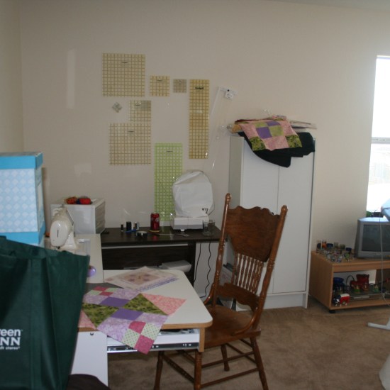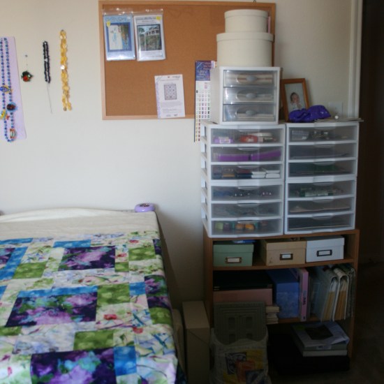The other two walls I intend to build out will have storage for fabric – LOTS of storage for fabric! A place for my ribbons and other embellishments, storage for all of my scrapbooking, jewelry making and needlework supplies, and hopefully room to grow as I add more fabric to my stash. I’m also hoping that I’ll be able to work out space for the soap and candle supplies I keep handy. On the other hand, I may have a solution worked out for the storage closet that will make better use of the space and give me a place to store that stuff downstairs, instead of having to carry it up and down the stairs every time I need to make something.