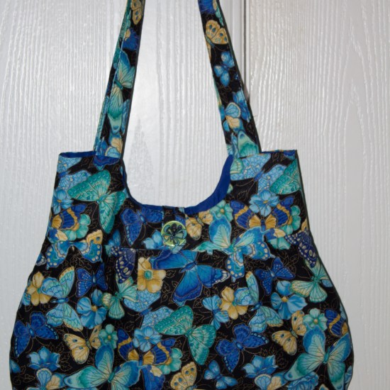 I wasn’t really happy with the button, but I didn’t have a lot of choice. My local JoAnn’s store’s button selection sucks – I was really just looking for a black and gold button, but they had nothing that fit the bill – so I settled for this. It doesn’t match exactly but I guess it works. The fabric came from my stash, and I used a really great blue by Kona for the lining. There is a pocket inside that is made from the same butterfly fabric as the outer shell (I would have posted a photo of the inside, but I couldn’t get a good one). I can’t think of a better way to use my favorite fabrics from my stash!