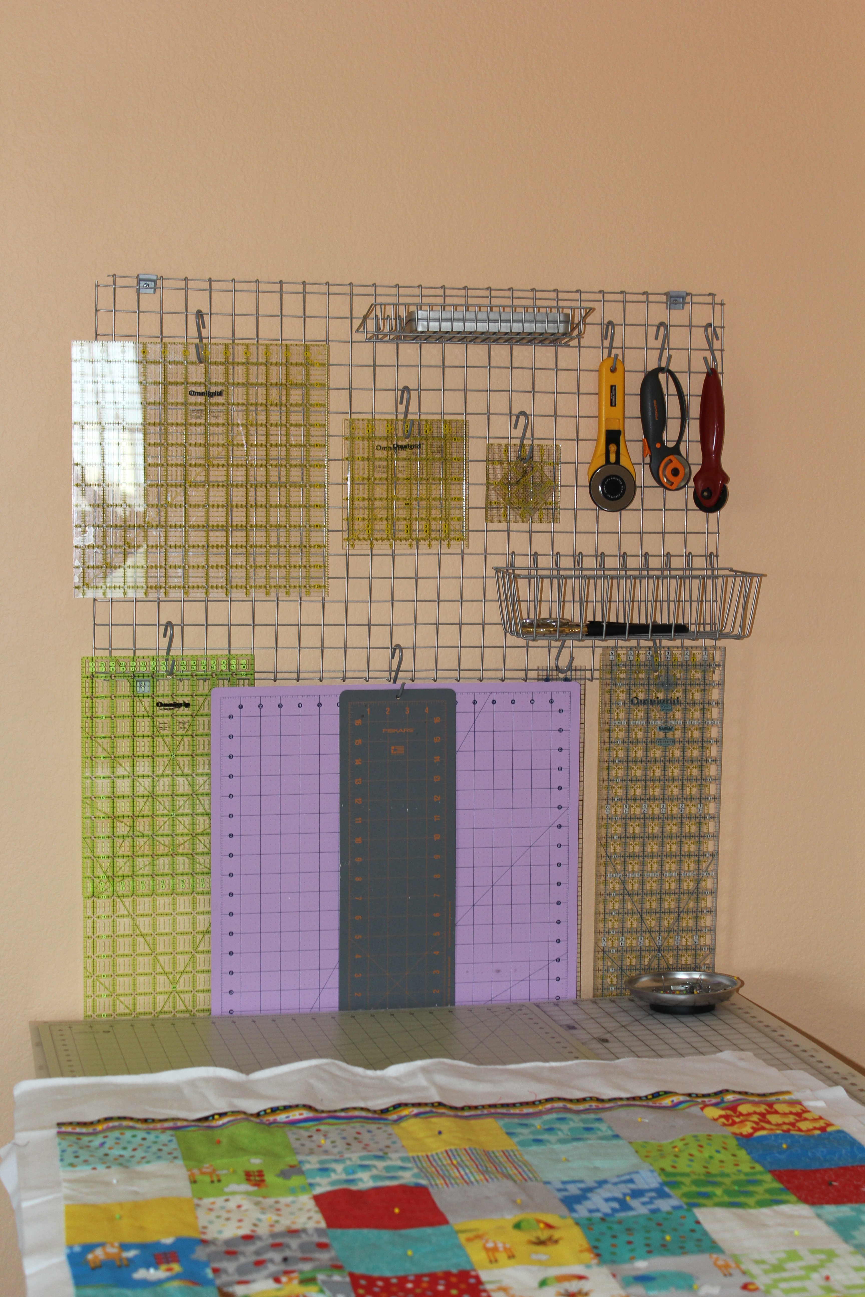 One of my favorite things about the room is this grid I bought to hang all of my rulers and some of my cutting implements (no this isn’t all of them, and trust me, you don’t want to SEE them all) …