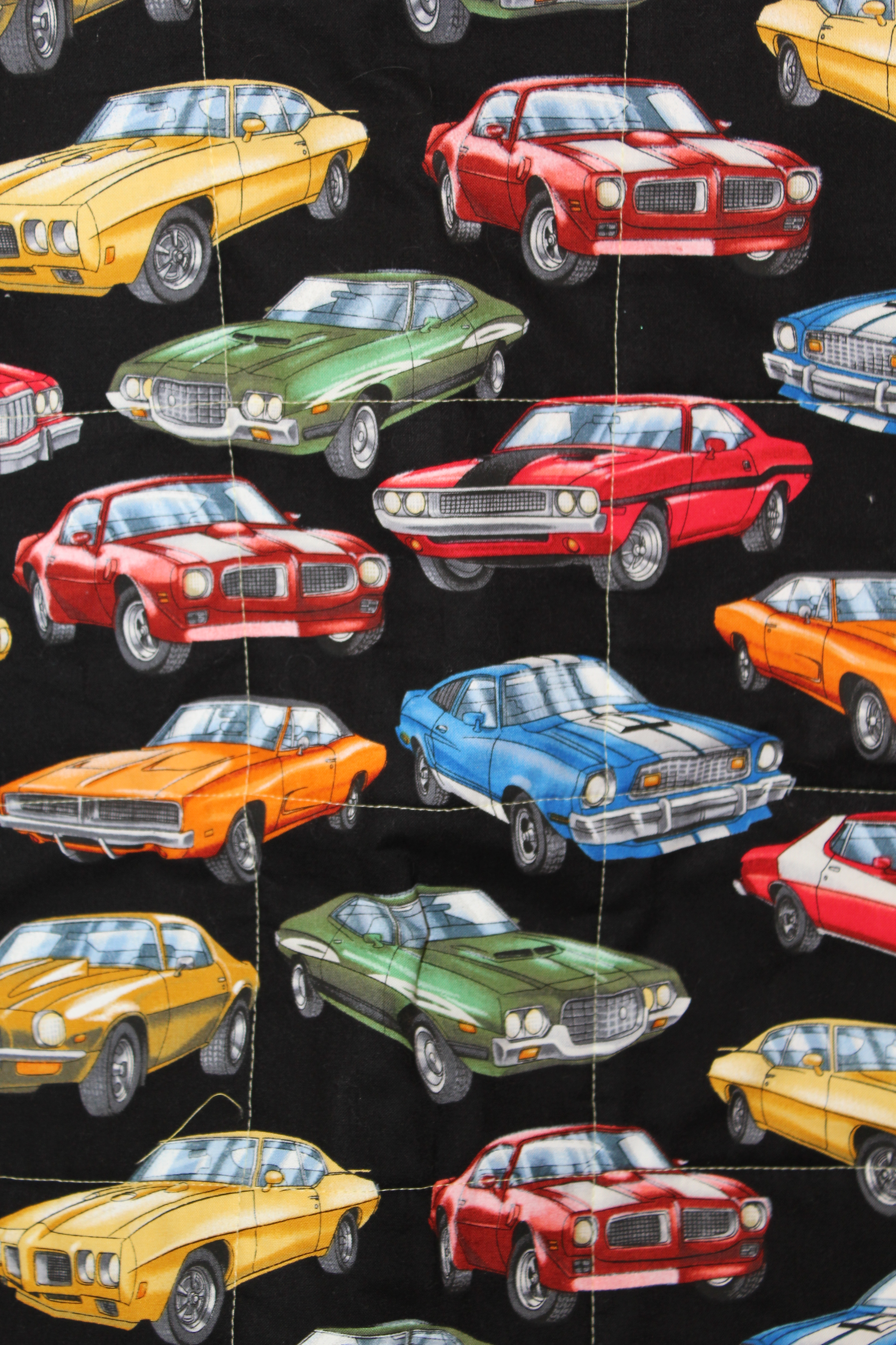 Once I realized that I’d spent three weeks trying to work out this problem, and I still had nothing to show for it, I decided to just sew the charm squares together and add a strip of Project Linus fabric to the top and bottom to elongate it bit to make the front of the quilt. I decided to back it with some cream colored fabric from my stash, and I even got as far as pinning the sandwich together like that then realized I really hated everything about the quilt. I think it’s because it didn’t work out the way I wanted it to, or maybe it was because I was disgusted with the panel, but the quilt sat on my table for two weeks while I painted my new studio and moved in and I barely even looked at it the entire time. Then one day last week, I was on my way to the office and I realized that the answer to my dilemma was in my fabric stash. I had bought two yards of American Muscle Car fabric to use for a quilt for my son, but he wasn’t really interested in it.