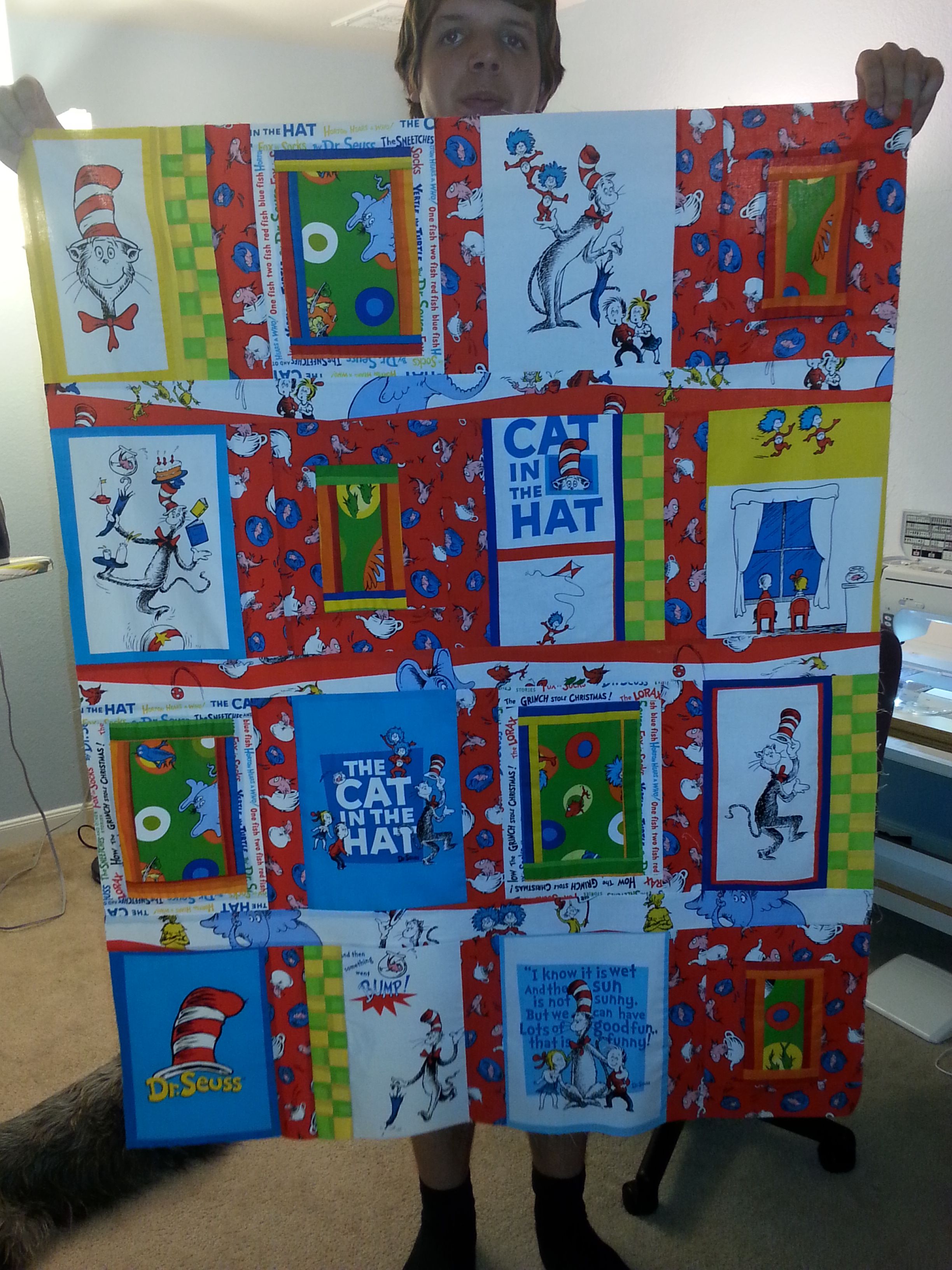 I’m not really thrilled with this quilt, though Travis’s friends Jayben and JT really seem to like it (Travis expressed no real opinion). There is too much going on here in the quilt, so when I make the Green Eggs and Ham quilt, I will use more solid and/or tone on tone fabrics to even out some of the busy-ness of the fabric. Also, as with all panels, this one wasn’t printed on the square, so some of the sashing is way off the row above it. It’s not a huge deal, I guess, and this section of the quilt is square … but the asymmetry of it bothers me a bit.