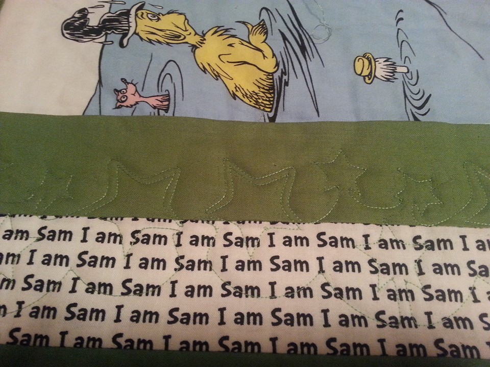 Secondly, I am still working on the Green Eggs & Ham quilt, and there is progress. The top is completely put together, the quilt is sandwiched and I started the “quilting” late last week. I’m using George to put stars on the quilt, both in the blocks and on the sashing.