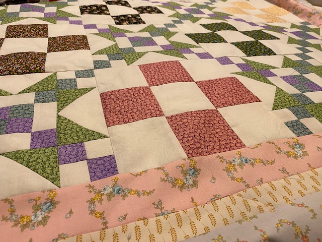 Now that I have so much time freed up from the lack of commute, I’ve been able to make real progress on my Little House on the Prairie Quilt. The top is completed, and I’m really happy with the way it turned out. This isn’t the best photo, but I didn’t have a helper when it came time to take photos.