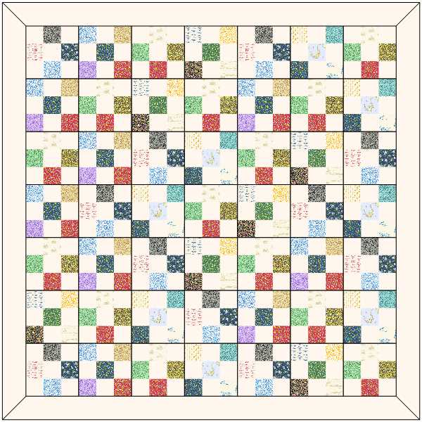 This quilt has been quite a journey for me. It’s the first quilt I designed using Electric Quilt 8, and the first time I ever contacted EQ about fabric that I wanted to use. They were super nice about it, and digitized the fabrics for me for free. Anyway, I had a bunch of fabric left over from the top, so I decided to create nine patch blocks in a checkerboard pattern. I created this in EQ8 as well.