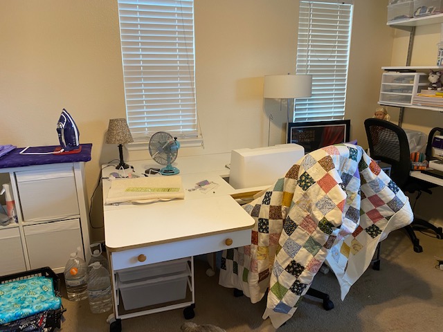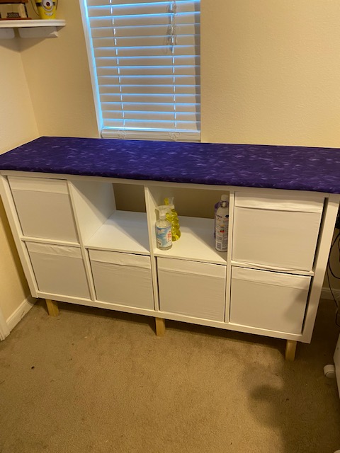 Not the best photo, but it’s sort of wedged in to that corner. A couple of months ago, I moved from a very large studio in our formal living and dining to a very small one in a secondary bedroom, and I’m still not used to the lack of space. But I do love this Kallax unit! Chris added six legs to the bottom to make it taller, and I made the top using a layer of Warm Company’s Insul Bright and a layer of their Warm & Natural Cotton Batting. Then I covered it with this beautiful purple fabric I got from Hobby Lobby. I’m keeping my regular ironing board in case I need it, but it won’t be in the studio anymore. I will be putting it in the closet in our bedroom. Please excuse the 16 year old carpet the landlord won’t replace; it’s been through a lot of kids, so even when it’s vacuumed, it still looks like crap.