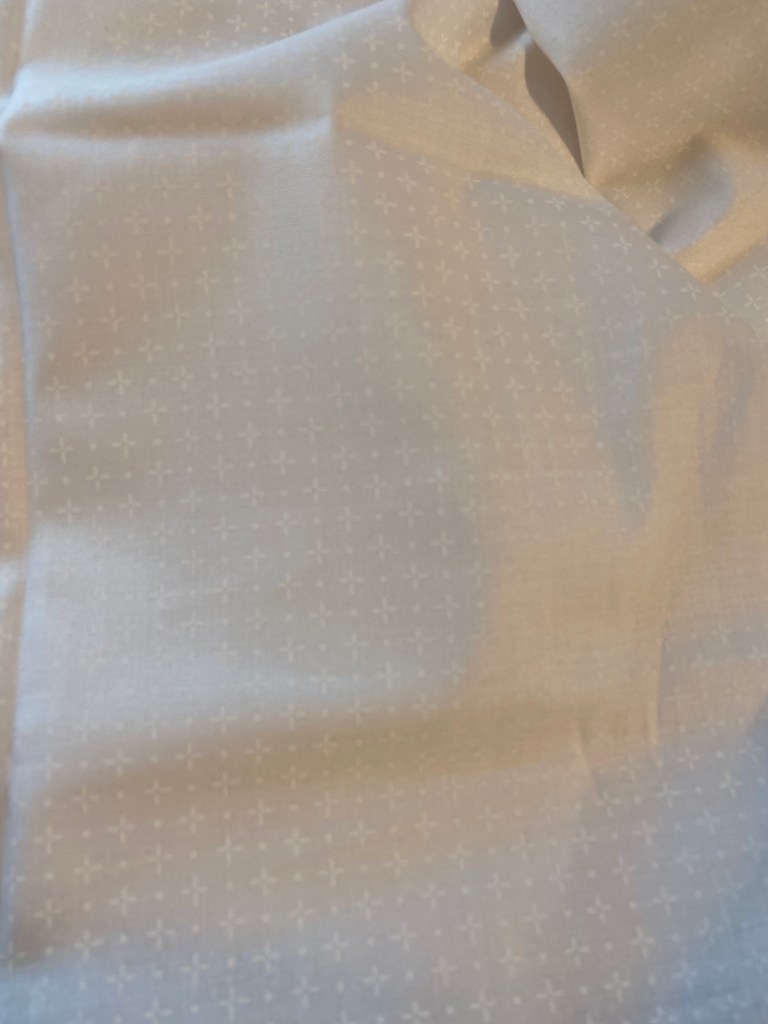 Not the best photos, I know, but my studio doesn’t have the best lighting. The whites are tone on tone white with three different patterns. The two blues are much closer in hue than they appear here, and together, all of them are stunning, in my opinion. I ordered the fabric from Connecting Threads when I couldn’t find enough blue and white locally. I mean, seriously – both of the quilt shops I went to were completely sold out of solid white and blue, which was my first plan for the quilt. When that didn’t pan out, I turned to the internet. I prefer to spend most of my quilting dollars with a local shop, but right now, that’s more difficult than you’d think when it comes to basics like solids and mottled fabrics.