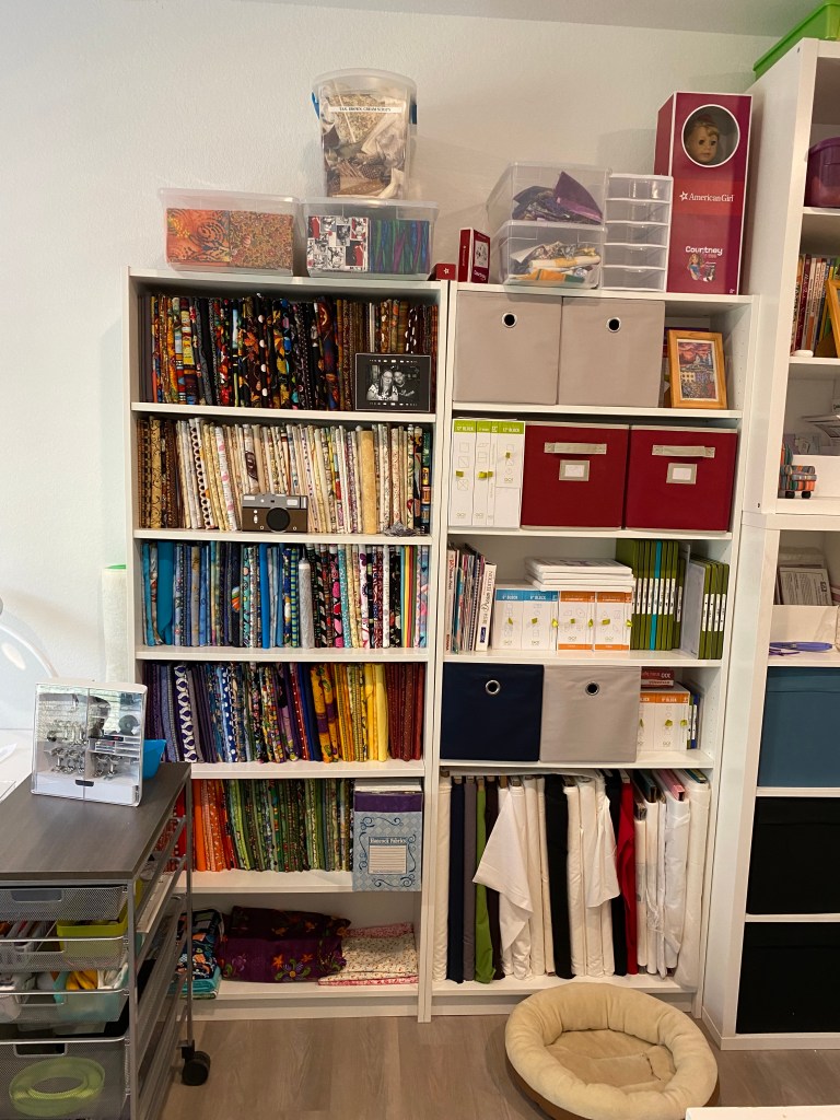 Across from that, on the other side of the room is another IKEA Kallax set up. I have packaged batting, pillow forms, my serger and cover stitch machines, more fabric and a host of other items here.