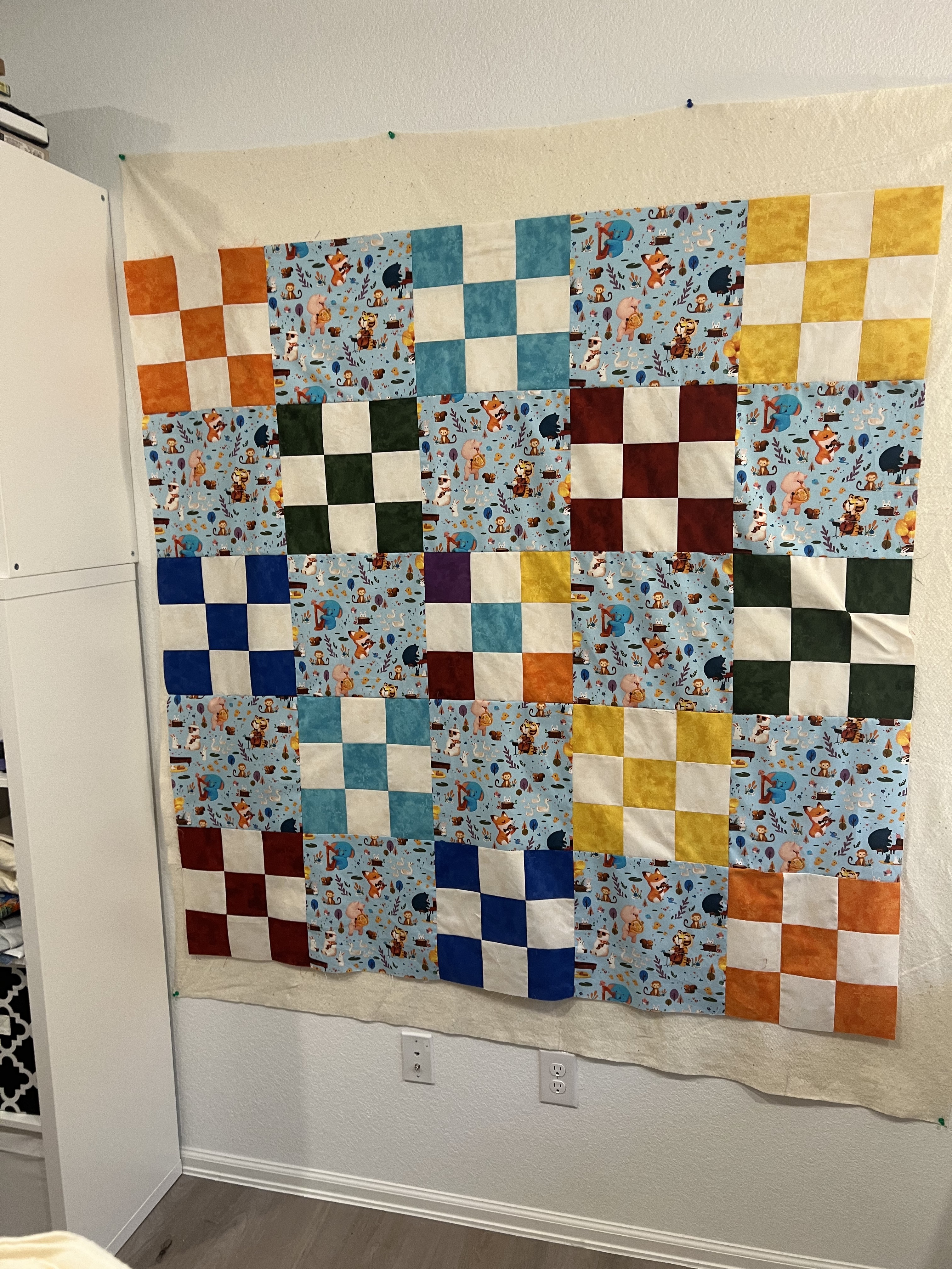 A simple nine patch quilt is always fun and easy to put together. I used Michael Miller’s Woodland Musicians fabric as my inspiration for the colors, and I love the way it went together. My plan is to quilt it using this Designs by Juju end to end quilting pattern.