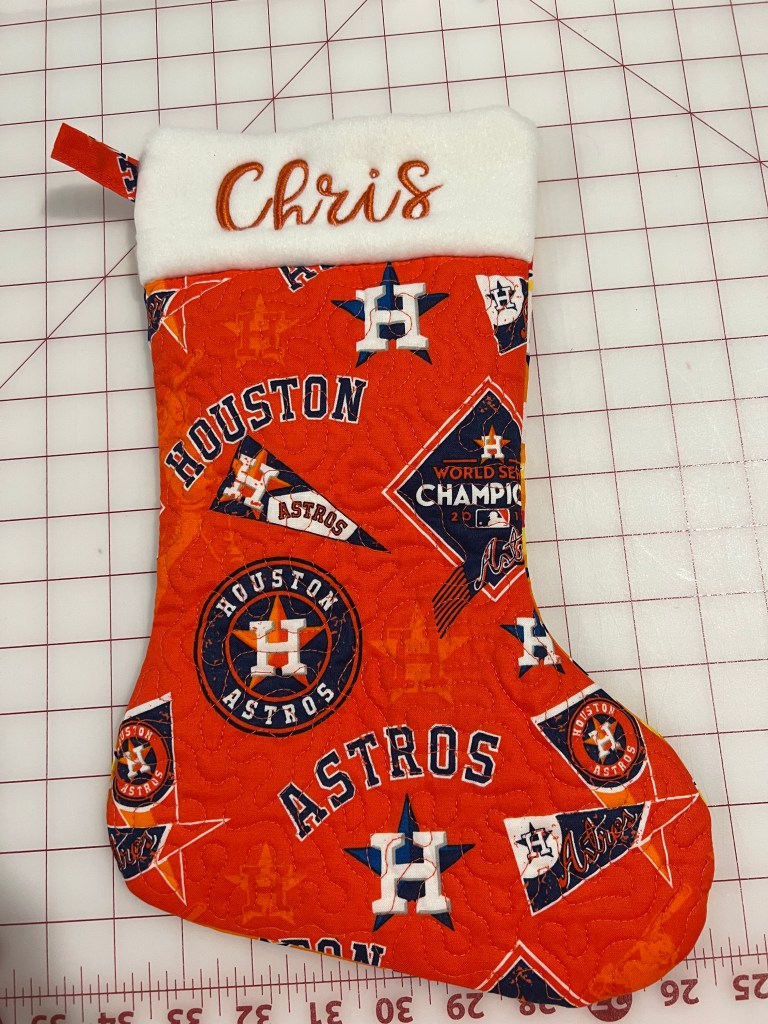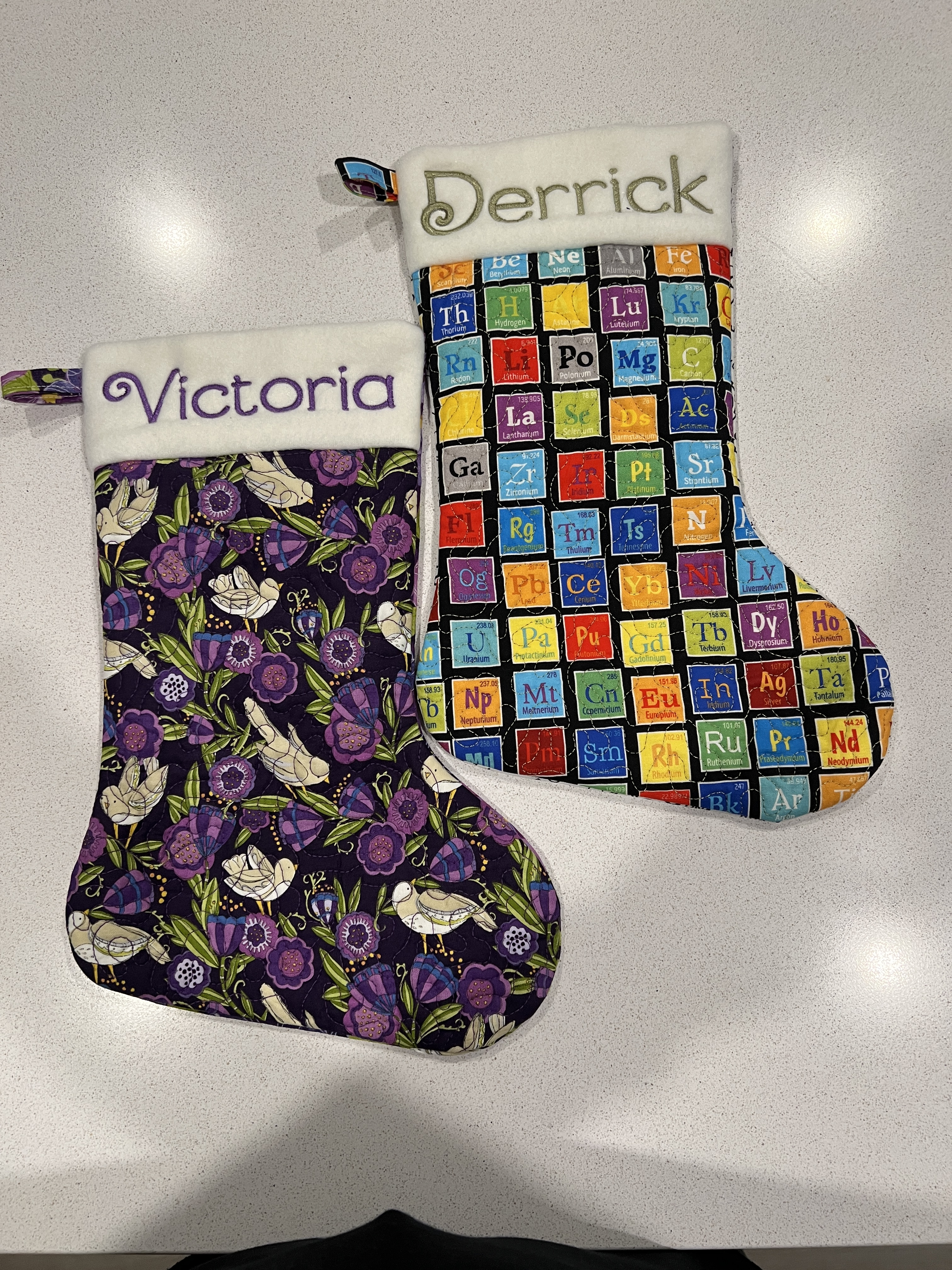 My grandson is all about science lately, so his stocking is naturally science themed. And my granddaughter loves all the animals and anything purple, so I think hers is self explanatory. 😉 These were made using the Designs By JuJu in-the-hoop quilted stocking design. It may be too late for 2022, but it’s never too late for next year! And yes, I’m already thinking about next year. I got this stocking done for my husband a couple of days after Christmas. I had everything cut and ready to go, but I just couldn’t get back to my machine before Christmas Day.