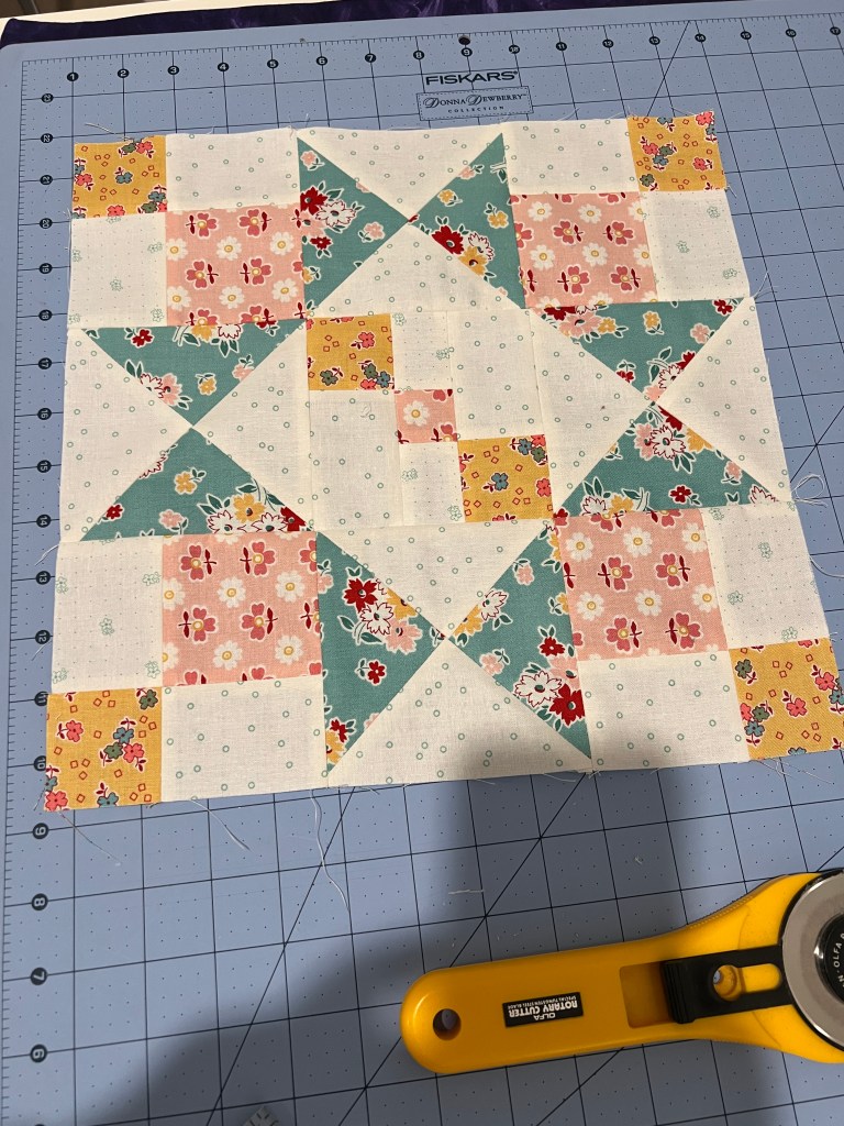 I realized last week that it had been a while since I’d visited my local quilt shop, so I decided to stop by there and see what they have going on, and I was so happy that I did! Every year, they do a $5 quilt block. You sign up for $10, and then you get the fabric to make a block. The next month, you take your finished block with you and you get the next block for free. If you don’t get it made, it’s just $5 to buy the new block. I didn’t participate last year; well, I started, but I wasn’t at all impressed with any of the fabrics they were using. This year, though, I had to sign up because they are using Lori Holt fabric. If there’s one thing that will convince me to sign up for something, it’s Lori Holt fabric. I finished my first block tonight, so I can take it with me next week to get the second block (I was late to the party, but I got in just in time!).