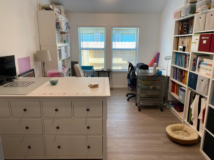 If there is one thing I have learned in the last several years of trying to find the “perfect” studio layout, it is that there is no such thing as a perfect studio layout. YouTubers will post videos at least annually about how much better their current incarnation of studio is than last year’s studio. Bloggers post beautiful photos of studios that are ready for photo shoots, but that I would find impossible to work in. Almost all of these studios have one thing in common – they aren’t all that functional. They are beautiful rooms, full of color and light and a bunch of fabric, patterns and other things. But what they lack is functionality.