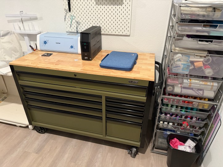 I kept coming back to the Husky mobile workbench/tool chest. I had a stacking Craftsman chest many years ago that I used to house all of my sewing/quilting implements. Back then, it was a lot easier to get almost everything in there, because I had a lot less to store. I knew it would be a good fit for sewing items, but those tool chests are big, bulky, and I already had a ton of stuff in my studio. Why would I add yet another piece of furniture? I kept telling myself I didn’t need it.