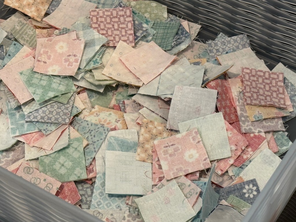 It was so nice to sit down at the sewing machine and just start sewing two squares together repeatedly. I’m more than halfway through the first step of piecing the 1.5″ squares, and I hope to have that done today. My plan is to have the entire top pieced by Christmas, which I don’t think will be too much of an issue. After all, this is a fairly easy block to make.