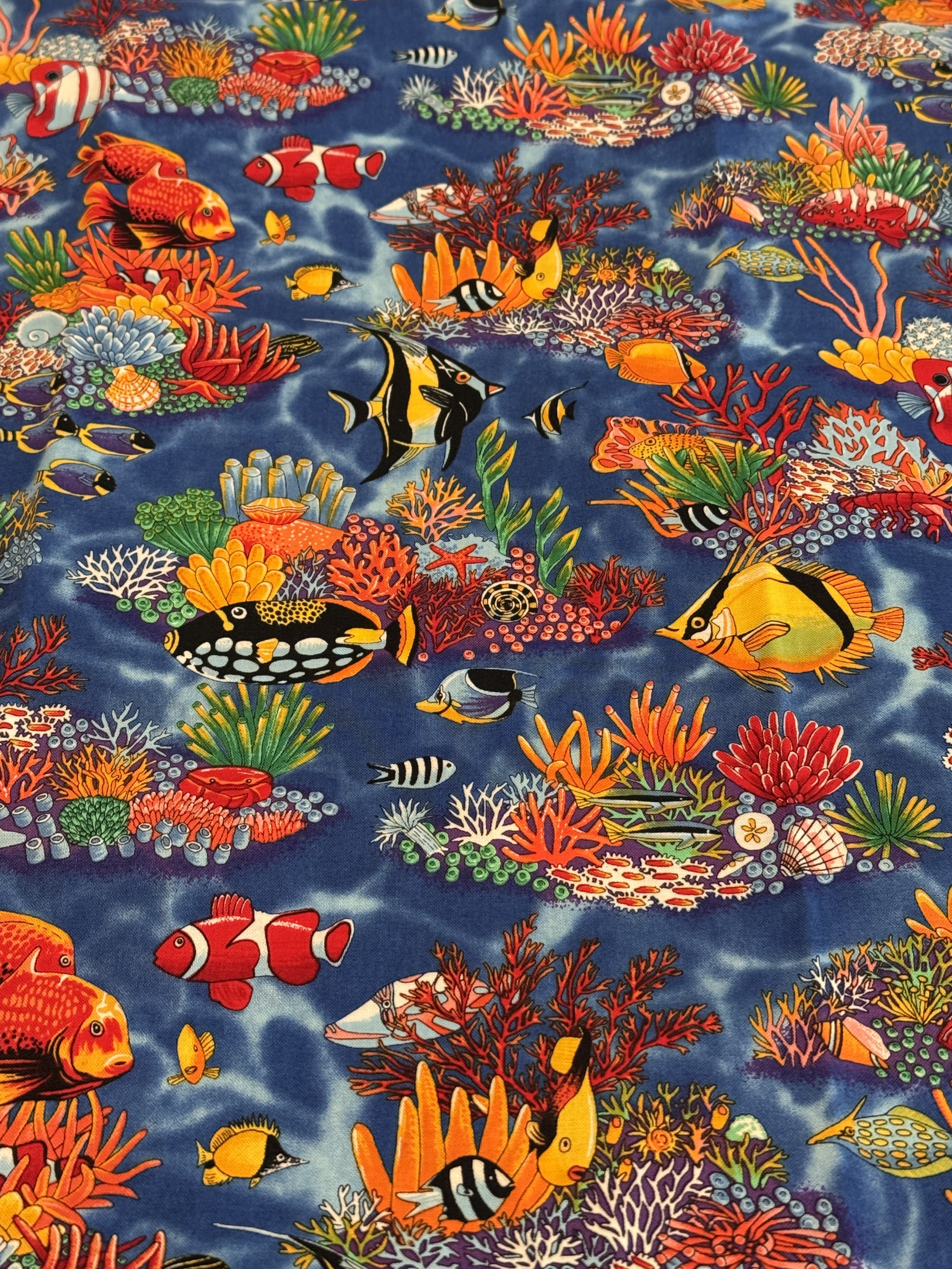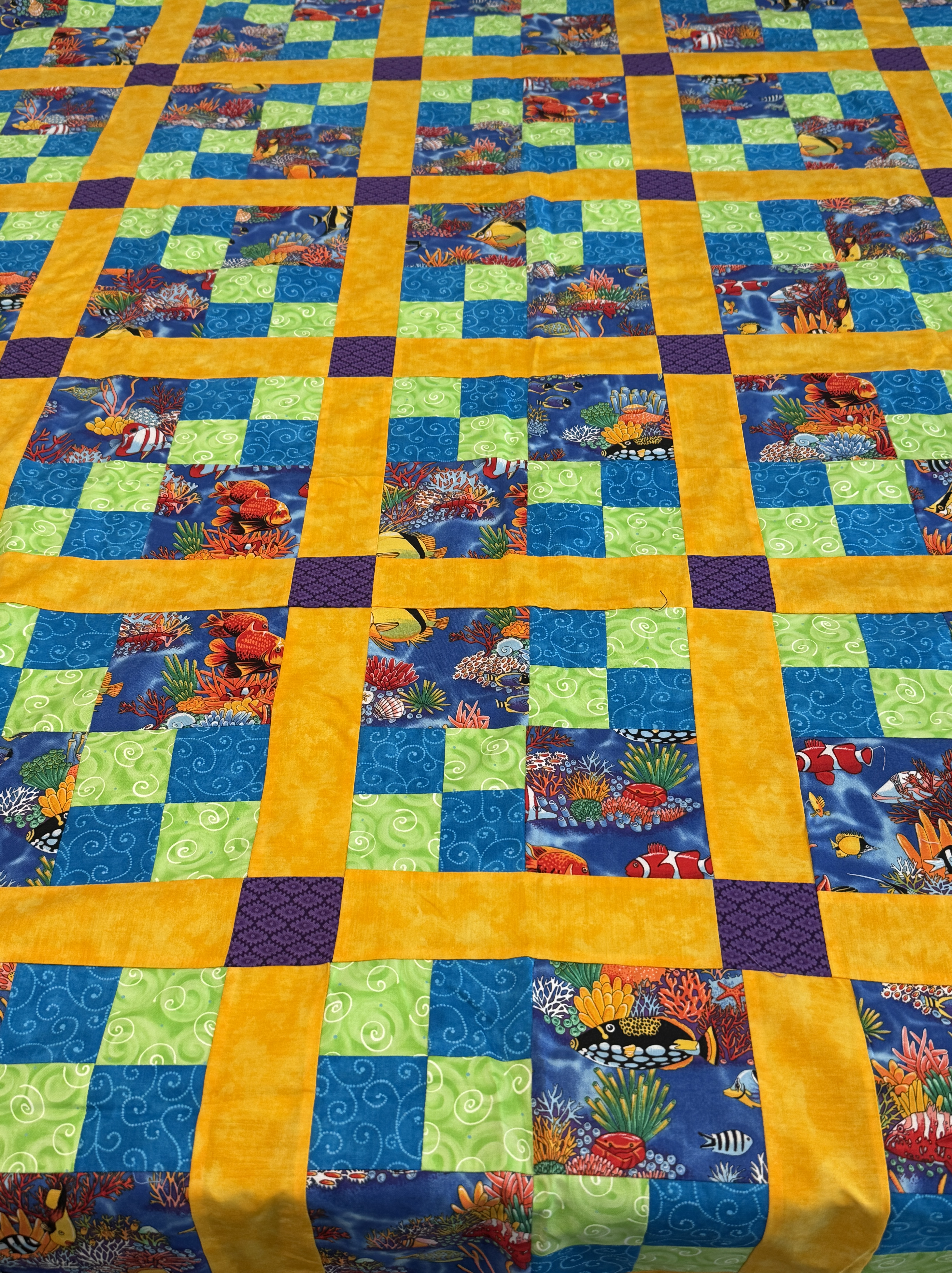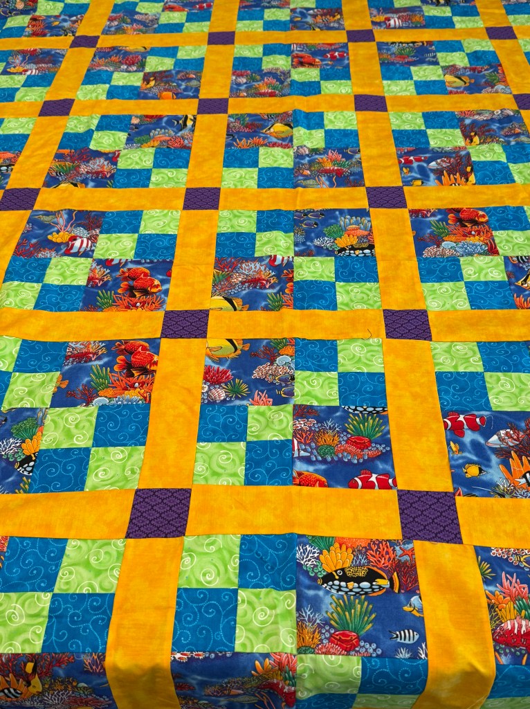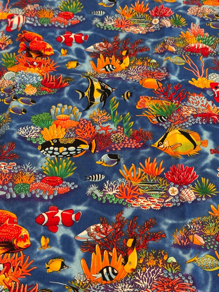This month’s UFO challenge is sandwiching, quilting and binding this quilt top. Yes, this is the quilt I pieced for my daughter more than 20 years ago. Yes, I’m still going to give it to her. The sea life focal fabric is from Robert Kaufman; I couldn’t tell you exactly when it was released, but it was in the early 2000s.