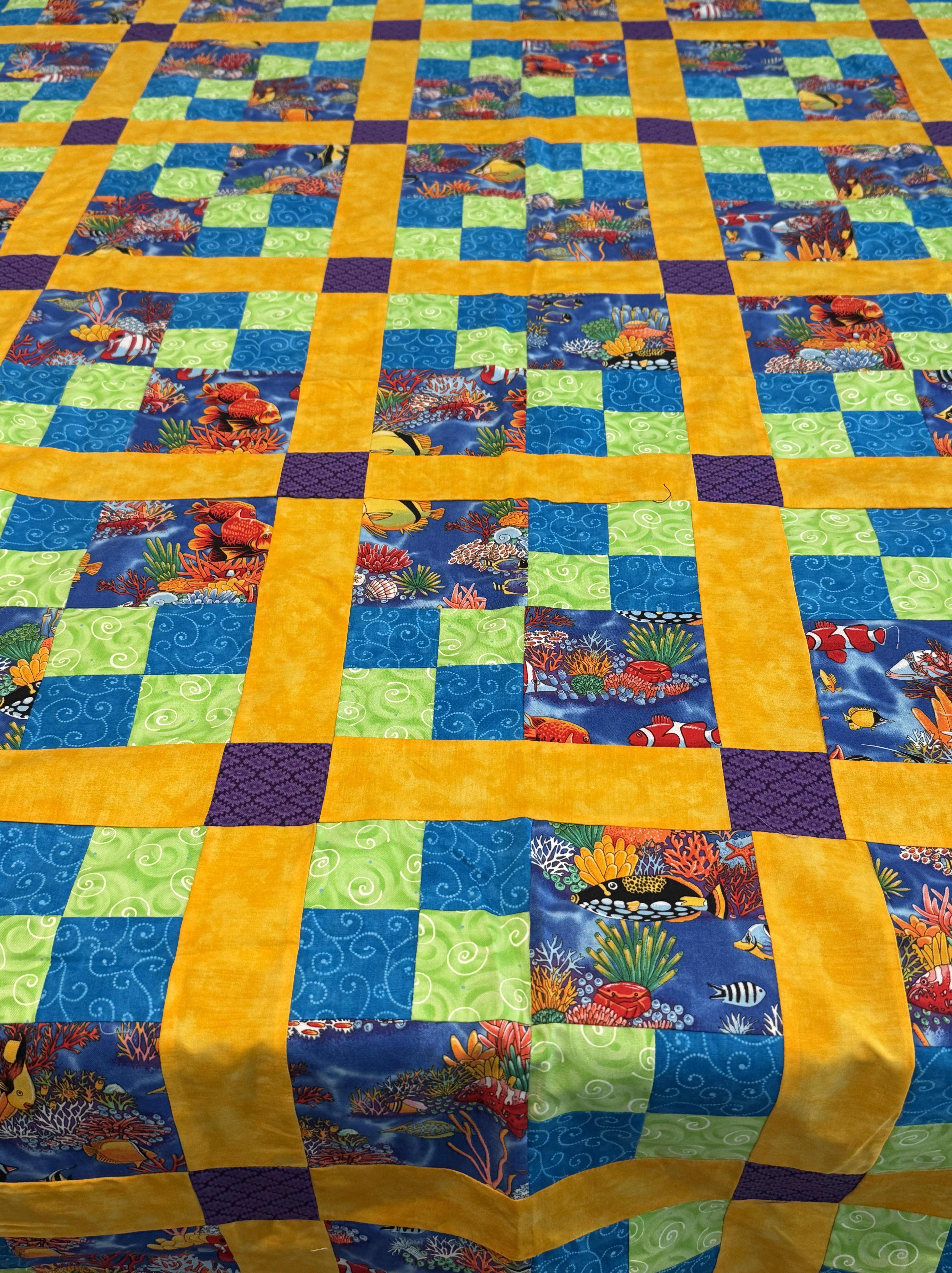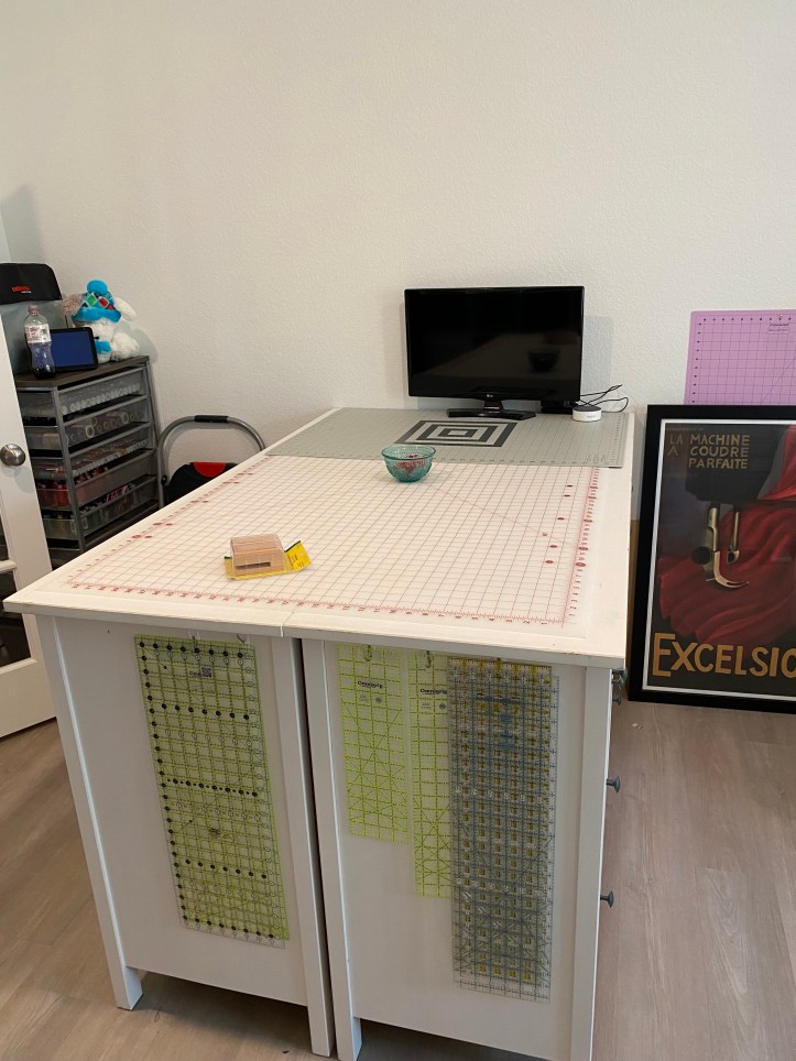 Sandwiching a quilt is my least favorite part of making a quilt, which is why I have nine quilt tops and/or table runners put together but not finished. I don’t know why I have such a mental block against sandwiching quilts, but here we are. I think I went through a period where I didn’t mind it as much, but between the cost of spray adhesive going up so much, and the fact that I don’t really like using spray adhesive in the house, I have returned to using safety pins to baste a quilt, and that is a challenge. I ordered a cutting mat big enough to cover the entire cutting table, and my cutting table top is covered with fabric and batting so it can also be used as an ironing station. That means that when I’m pin basting, I have been known to pin the quilt to the table. Hence, the large mat.